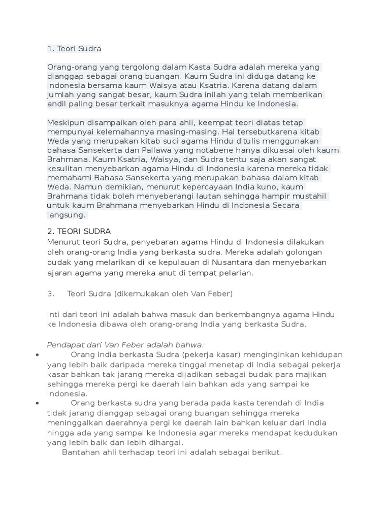 Kunci jawaban intan pariwara kelas 12 agama islam edisi lama buku guru sejarah kelas 10 edisi revisi. Nah, proses masuknya agama hindu dan budha ini ke indonesia dikaju dalam beberapa teori yang dikemukakan oleh beberpa ahli. Para pendeta pantang untuk menyebrang lautan. Para pedagang yang termasuk dalam kasta waisya tidak menguasai bahasa sanskerta dan huruf pallawa yang umumnya hanya dikuasai oleh kasta brahmana. Kelebihan dan kelemahan teori brahmana Selain itu, tidak ada sumber yang menyebutkan adanya perpindahan ksatria india ke nusantara. Golongan sudra tidak menguasai seluk beluk ajaran agama hindu sebab mereka tidak menguasai bahasa sansekerta yang digunakan dalam kitab suci weda (terdapat aturan dan ajaran agama hindu). Widya duta surakarta, penulis :ibnoe soewarso) category: Teori yang dimaksud meliputi teori waisya, teori kesatria, teori brahmana, teori arus balik atau bisa disebut juga teori nasional.