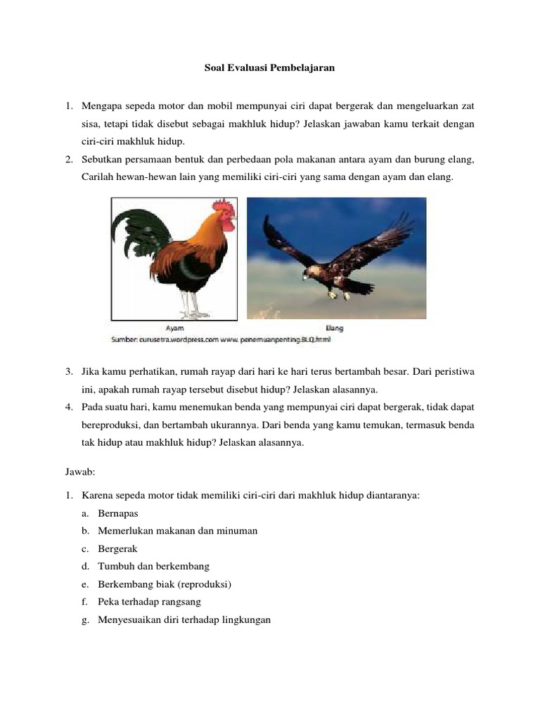Carilah hewan² lain yg memiliki ciri² yg sama dgn ayam dan elang.2.jika km perhatikan, rumah rayap dari hari ke hari terus bertambah besar. Perbedaan pola makan antara ayam dan burung elang yaitu ayam merupakan hewan omnivora artinya makan segala jenis makanan, sedangkan burung elang merupakan hewan karnivora artinya hanya makan daging. Persamaan bentuk pola makanan antara ayam dan burung elang yaitu sama sama makan dengan paruh, kemudan masuk ke kerongkongan, tembolok, lambung, usus halus, usus besar dan keluar sisa makanan lewat anus. • elang termasuk karnivora karena memakan daging. Persamaan bentuk antara ayam dan burung elang adalah keduanya memiliki sayap, paruh, dua kaki, serta cakar. Jika kamu perhatikan, rumah rayap dari hari ke hari terus bertambah besar. Perbedaan teladan masakan antara ayam dan burung elang yaitu pada jenis makanannya, ayam memakan biji bijian sedangkan elang. Pada suatu hari kmu menemukan benda yg mempunyai ciri dapat. Sebutkan persamaan bentuk dan perbedaan pola makanan antara ayam dan burung elang.
