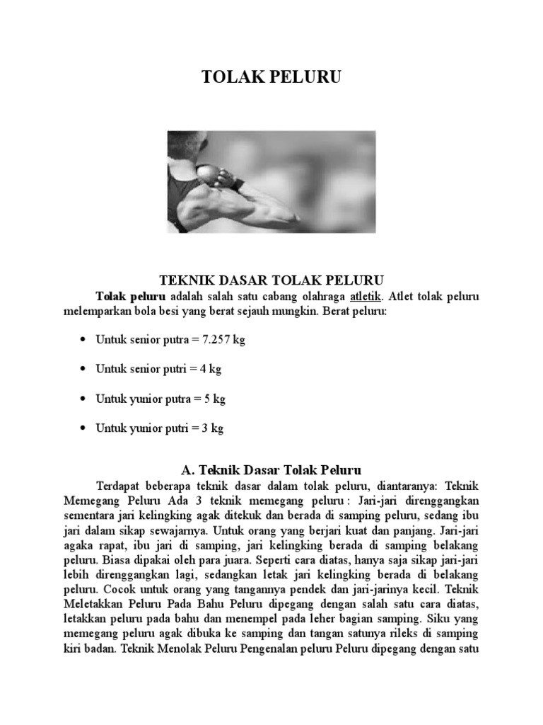 Untuk putra senior berat peluru sekitar 7.257 kg, sementara itu untuk pria junior atau pemula berat pelurunya lebih ringan yaitu sekitar 5 kg saja. Tolak peluru adalah salah satu cabang olahraga atletik. Putra senior = 7.257 kg 4. Peluru dengan berat 5 kg digunakan oleh kategori. Kriteria tersendiri dari alat hingga lapangan yang digunakan. Berat peluru untuk junior putra adalah 5 kg atau 5.45 kg dengan diameter 115±2mm. Suatu bentuk gerakan menolak atau mendorong suatu alat bundar (peluru) dengan berat tertentu yang terbuat dari logam, yang dilakukan dari bahu dengan satu tangan untuk mencapai jarak sejauh jauhnya. Kemudian, ada beberapa jenis gaya tolak peluru yang biasanya digunakan saat. Untuk senior putri berat peluru yang digunakan yaitu 4 kilogram atau sekitar 8,8 pon, yang diterapkan dalam kejuaraan terbuka hingga olimpiade.