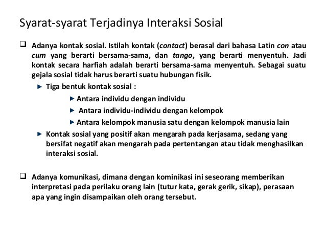Adanya komunikasi, arti penting komunikasi adalah ada tindakan seseorang untuk menyampaikan pesan dari pihak satu ke pihak lain. Disini akan menjelaskan tentang interaksi sosial : Dua syarat terjadinya interaksi sosial : Hubungan unik ini kemudian membuat manusia berkumpul menjadi satu kelompok masyarakat yang saling mendukung hingga terjadi integrasi. Dengan adanya komunikasi tersebut, sikap. Dari jauh tampak sebuah sepeda motor yang dikendarai oleh seseorang yang mengenakan seragam. Syarat terjadinya intera ksi sosial terdiri atas kontak sosial dan komunikasi sosial. Kontak sosial menjadi salah satu syarat terjadinya interaksi sosial. Menurut john lewis gillin, proses interaksi sosial hanya dapat terjadi jika memenuhi dua syarat, yaitu;