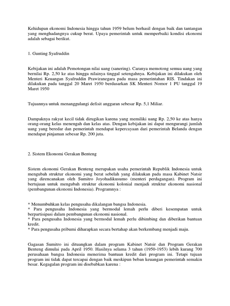 Membatasi masuknya pengusaha swasta asing ke indonesia Memberikan bantuan kredit kepada para pengusaha pribumi agar dapat bersaing dengan pengusaha ekonomi b. Menghindarkan persaingan antara pengusaha pribumi dan pengusaha nonpribumi b. Sistem ekonomi gerakan benteng merupakan sistem ekonomi yang dicetuskan oleh menteri perdagangan sumitro djojohadikusumo pada masa pemerintahan kabinet natsir. Dengan demikian, tujuan dari sistem ekonomi. Adapun tujuan dari sistem ekonomi ali baba adalah untuk memperbaiki perekonomian, dan juga melakukan peningkatan ekonomi kaum pribumi. Memberikan bantuan kredit kepada para pengusaha pribumi agar dapat bersaing dengan pengusaha ekonomi. Menteri keuangan kabinet hatta ii, syafruddin prawiranegara mengusulkan kebijakan sanering. Sistem ekonomi gerakan benteng merupakan usaha pemerintah republik indonesia untuk mengubah struktur ekonomi yang berat sebelah yang dilakukan pada masa kabinet natsir yang direncanakan oleh sumitro djojohadikusumo (menteri perdagangan).program ini bertujuan untuk mengubah struktur ekonomi kolonial menjadi struktur ekonomi nasional.